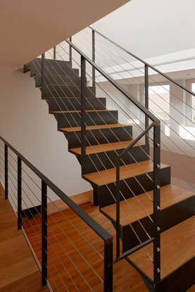 Die Deckenbalkenlagen werden brandschutzgerecht ergänzt, von der Eingangsebene bis zur Dachempore entsteht ein Turmraum, über den das Licht zu allen Tageszeiten herabgesendet wird. Eine schwebende Treppe bringt die Bewohner zu einer im Sommer mit dem Innenraum schwellenlos verknüpften Dachterrasse.