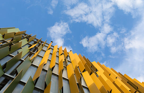 Als äußere Hülle, die das Gebäude über fast den gesamten Fassadenbereich bekleidet, ist eine vertikal ausgerichtete, lamellenartige Metallkonstruktion aus zweifarbigen, gekanteten Blechpaneelen gewählt worden, die unterschiedlich geneigt sind.